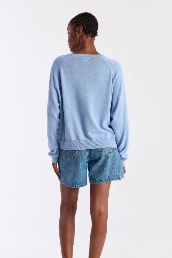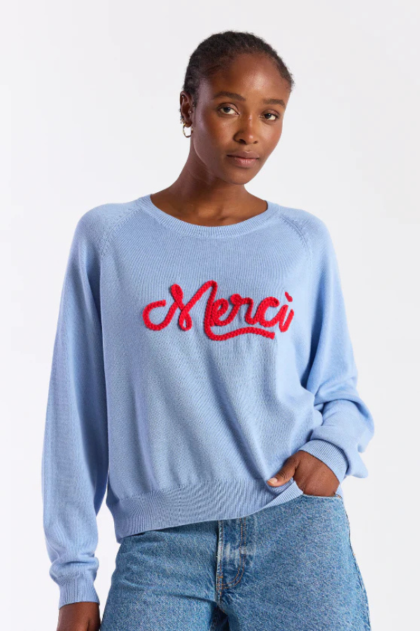 Regular price $158.00 Save Liquid error (snippets/product-template line 131): Computation results in '-Infinity'%Get ready to love the Merci Raglan Crew Sweater! Decked out in a dreamy skyline blue with a poppin' red "merci" script, it’s the perfect mix of cozy and cute for Cupid's big day (or, you know, any day you feel like spreading the love). You'll look so good, hearts will be skipping!