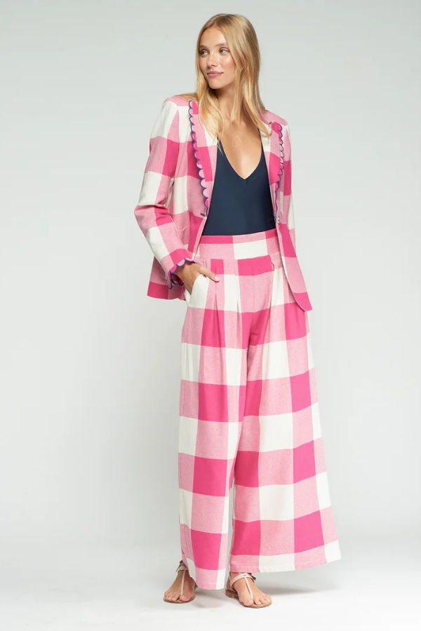 Large gingham jacket in pink and white, classic lapel decorated with contrasting blue wavy trim. Single-button front closure and visible patch pockets. Includes wavy trim detail at the cuffs.