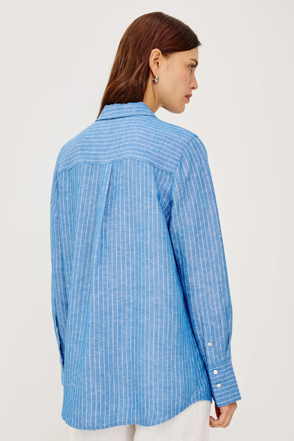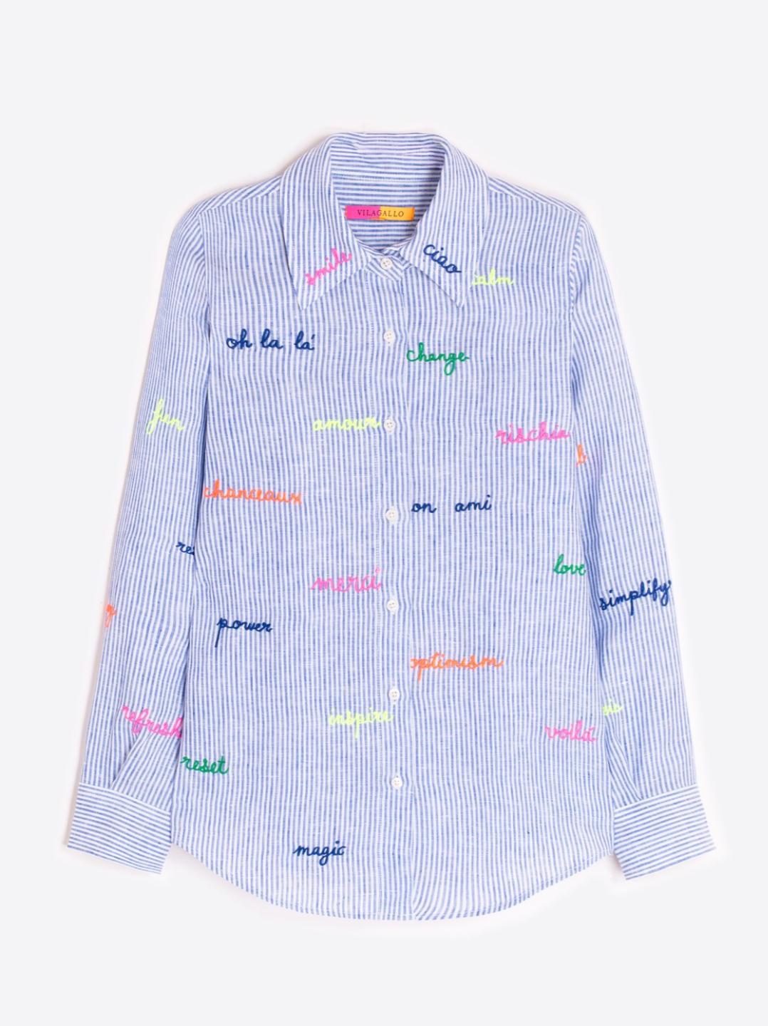 Regular price $180.00 Save Liquid error (snippets/product-template line 131): Computation results in '-Infinity'%This blue striped linen blouse is made from 100% breathable linen, giving it a lightweight, comfortable feel you can wear all day. The classic pinstripe keeps it clean and versatile, while the colorful embroidered words add a subtle, fun detail.