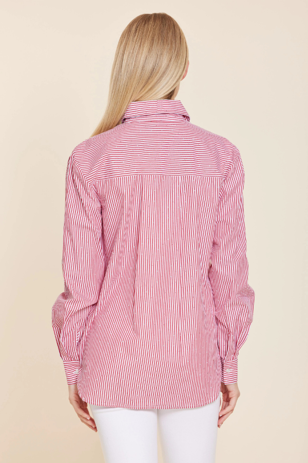Regular price $92.00 Save Liquid error (snippets/product-template line 131): Computation results in '-Infinity'%Classic with a subtle touch of sparkle. This striped button-down shirt features delicate micro rhinestone detailing throughout, adding an elevated shimmer to a timeless silhouette. Designed with a crisp collared neckline, full-length sleeves, and a relaxed fit, this lightweight women’s blouse is perfect for spring and summer styling. The romantic red stripe makes it an effortless choice for Valentine’s Day outfits, brunch dates, and daytime occasions, blending everyday sophistication with refined glamour. Also available in a classic and crips blue.