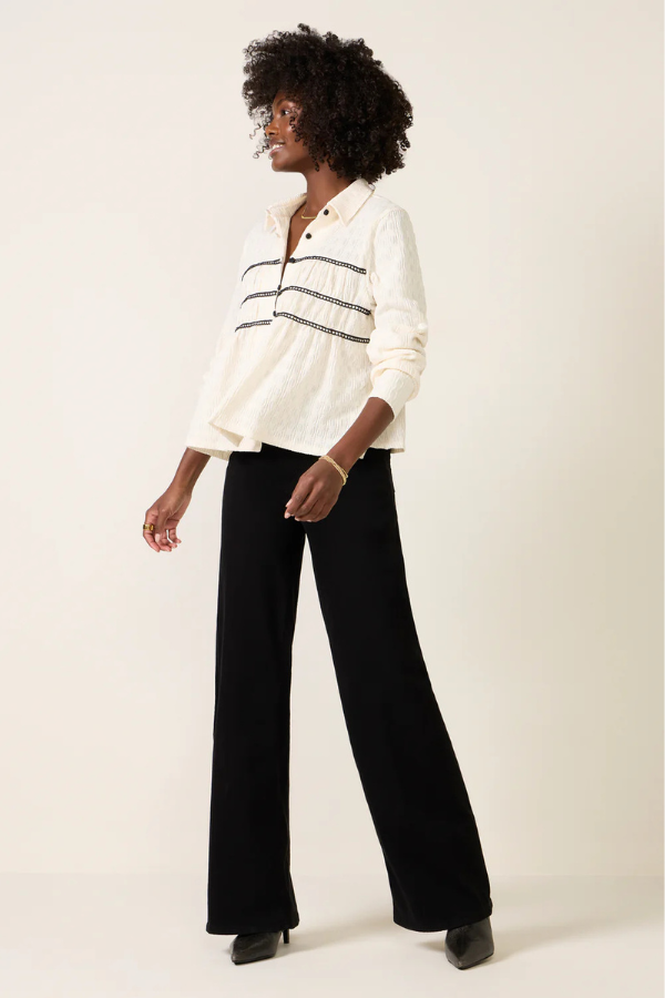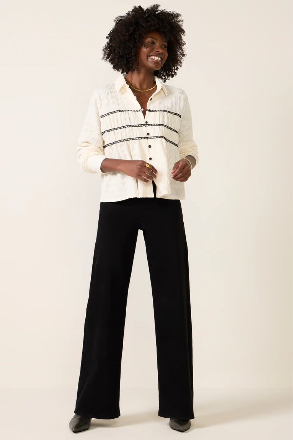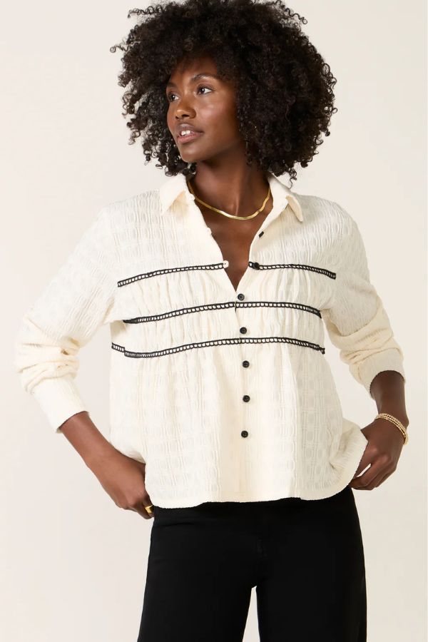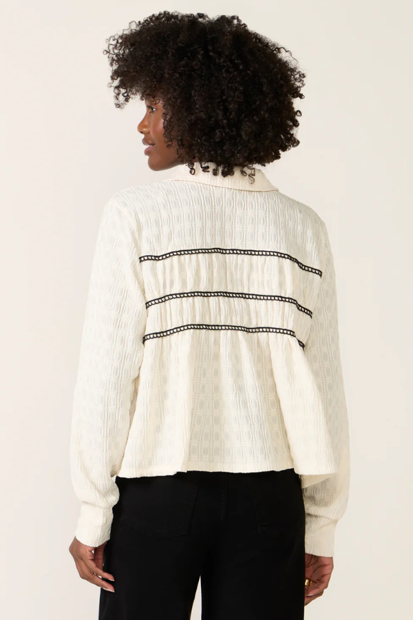 Regular price $145.00 Save Liquid error (snippets/product-template line 131): Computation results in '-Infinity'%Add a sweet, feminine touch to your button-down collection with the Alice Top by LNA, featuring a classic collar, a slightly cropped, flowy silhouette, and contrast lace detailing.