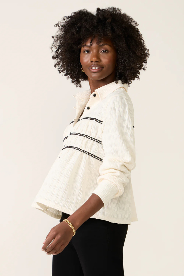 Regular price $98.00 Save Liquid error (snippets/product-template line 131): Computation results in '-Infinity'%Kylee is a 2x1 ribbed long sleeve with a collar and snap front.