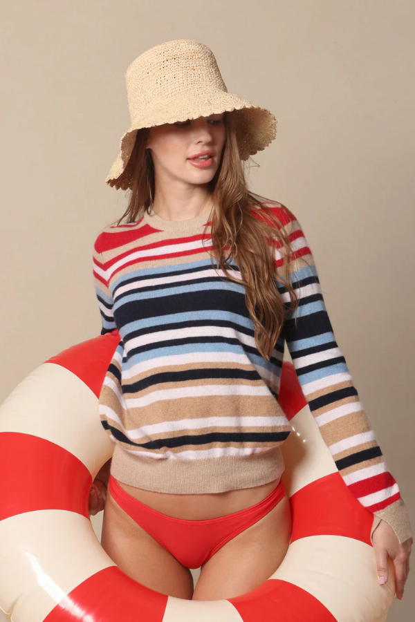 Regular price $396.00 Save Liquid error (snippets/product-template line 131): Computation results in '-Infinity'%Bright stripes meet cloud-soft cashmere in this standout crew neck—now with subtle shoulder pads for a softly sculpted shape. Lightweight, breathable, and endlessly wearable, it adds a hit of color to any outfit. Dress it up or keep it casual—either way, it’s the sweater that makes getting dressed feel fun.