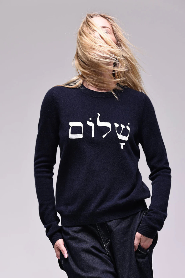 My two Jewish grandmothers, Minnie and Rose, were the pillars of my family. They were both strong, independent women who had survived a great deal in their lives. Their legacy taught me love, peace, resilience, fortitude, and important values that I hold with me to this day. I created this sweater in honor of my family to yours. Shalom is Hebrew for peace. This sweater represents the unity and solidarity of our culture.