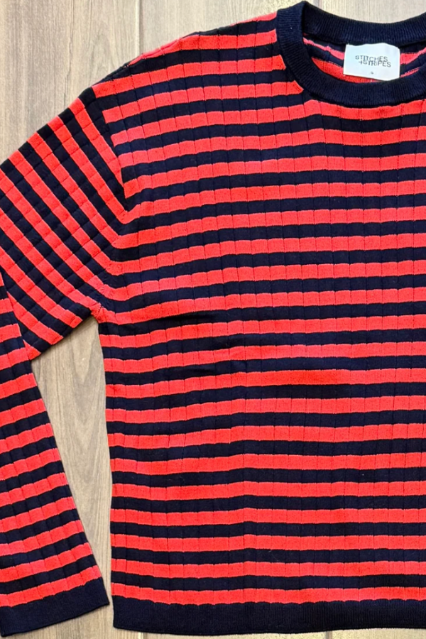 Regular price $108.00 Save Liquid error (snippets/product-template line 131): Computation results in '-Infinity'%Stripes never go out of style-especially when they're this charming! The Libby Pullover Sweater features a classic red and blue striped design that brings instant personality to any outfit. The cozy pullover silhouette makes it perfect for layering on cooler days or wearing solo when you want effortless style. Whether you're heading to brunch or keeping it casual, this timeless piece pairs beautifully with jeans, skirts, or your favorite bottoms. A wardrobe essential that proves stripes are always a good idea.
